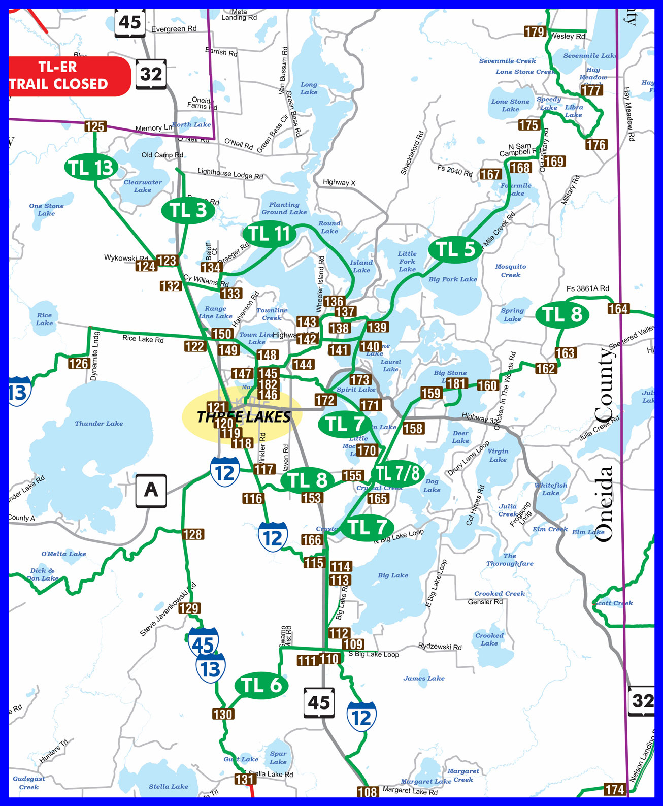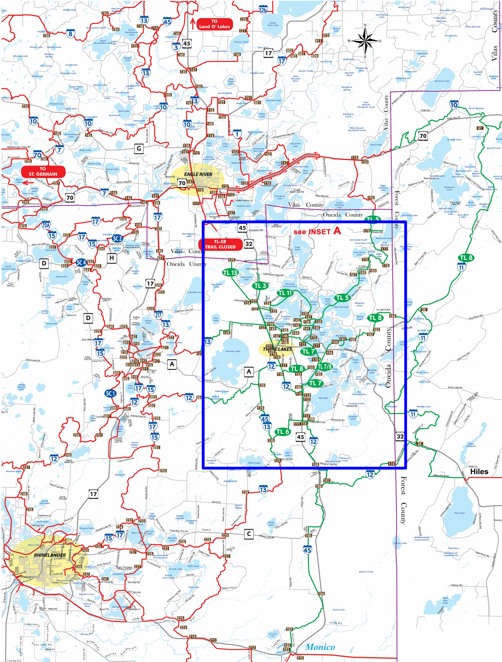 Request postal mailed map: Three Lakes Area Visitors Bureau.